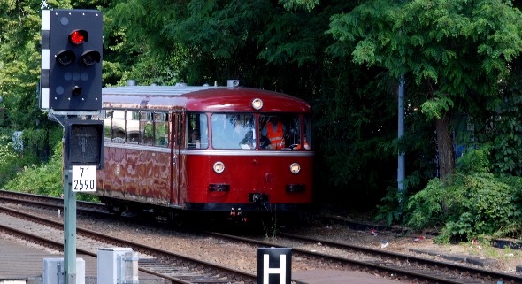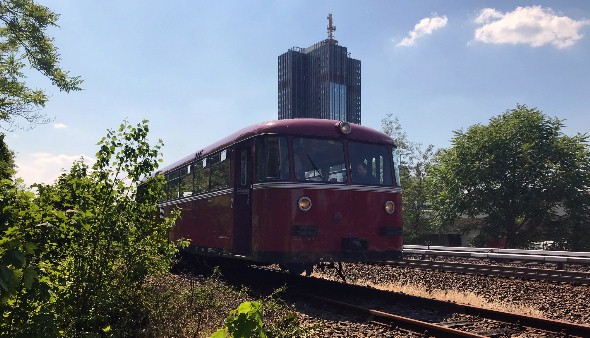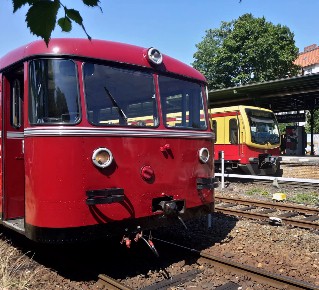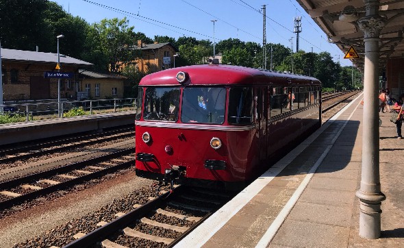 Und diesmal gab es etwas Besonderes. Aus Anlass des 180-jährigen Bestehens der ersten preußischen Eisenbahn (Berlin-Potsdam) haben die Berliner Eisenbahnfreunde eine Schienenbus-Sonderfahrt von Berlin-Gesundbrunnen nach Lichterfelde West mit ihrem VT 95 9396 veranstaltet.