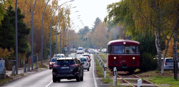 ... auf dem Rückweg nach Schönow beim Überqueren des breitesten Bahnübergang Berlins: Sundgauer Straße.